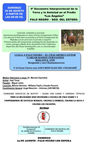 Además de las actividades centrales, habrá servicio de buffet completo, con asado con cuero y comidas típicas para que los asistentes disfruten de una experiencia gastronómica inigualable. Toda la recaudación de la jornada será destinada a la Escuela de Palo Negro y tres cooperadoras de escuelas rurales, beneficiando a las comunidades de La Romelia, Colonia La Selva y Colonia Los Encantos. El evento cuenta con el respaldo del «Establecimiento El Temporal» de Adalberto Pereyra y Familia, y la Comisión Municipal de Palo Negro.
