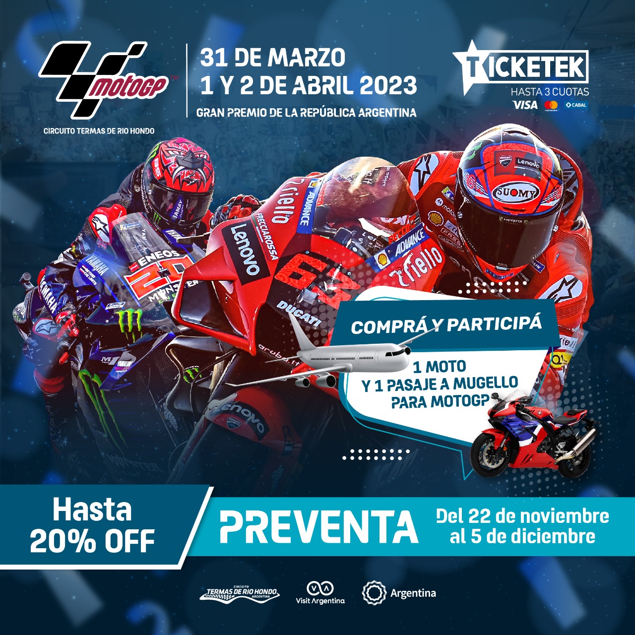 A partir de hoy martes 22 de noviembre hasta el 5 de diciembre, se habilita la 𝗣𝗥𝗘𝗩𝗘𝗡𝗧𝗔 𝗰𝗼𝗻 𝗱𝗲𝘀𝗰𝘂𝗲𝗻𝘁𝗼𝘀 𝗱𝗲 𝗵𝗮𝘀𝘁𝗮 𝟮𝟬% 𝗲𝗻 𝗹𝗮𝘀 𝗲𝗻𝘁𝗿𝗮𝗱𝗮𝘀 para ver el Gran Premio de la República Argentina de MotoGP 2023.