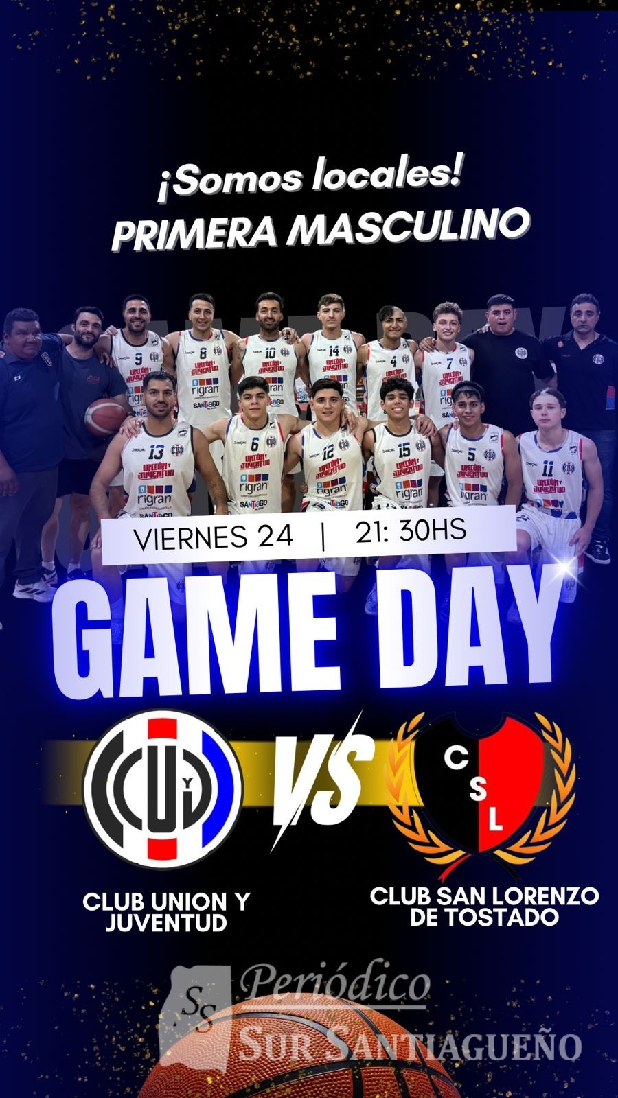 BANDERA, Santiago del Estero. – La pasión por el básquetbol se enciende una vez más en Bandera. El Club Unión y Juventud se prepara para ser local en un emocionante encuentro de Primera Masculino este viernes 24 a las 21:30 horas, cuando reciba al Club San Lorenzo de Tostado. El cartel de «Game Day» que exhibe el equipo local anticipa un choque que promete grandes emociones y un alto nivel de juego.