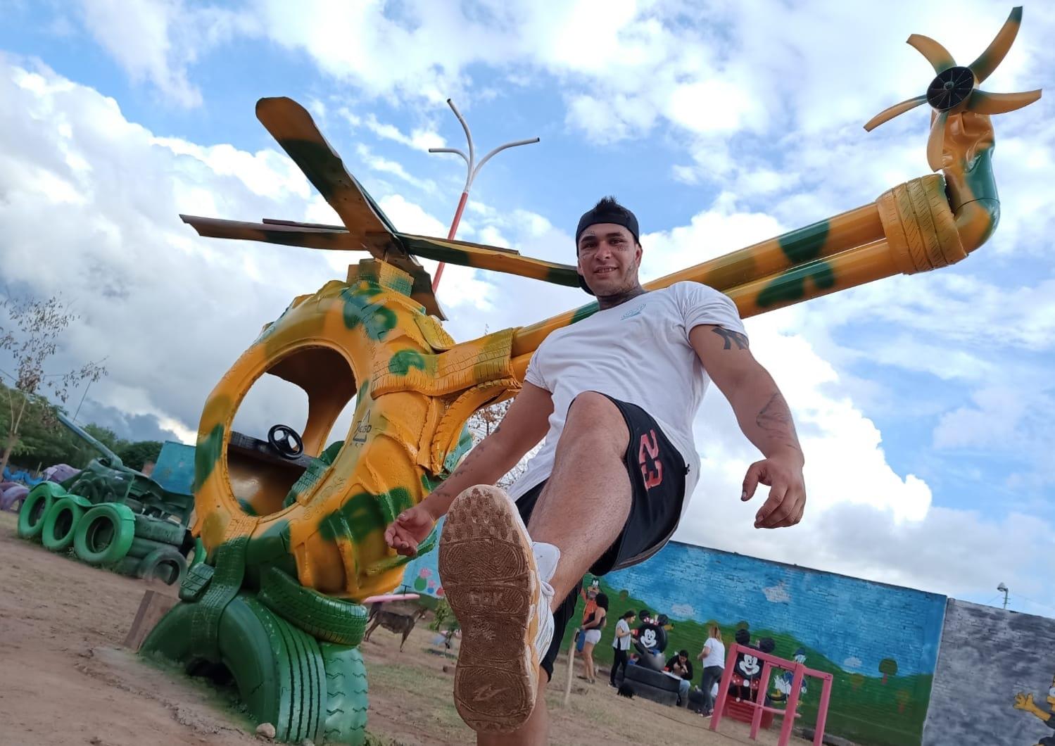 Para tal fin, Diego Artes recicló más de 4 mil cubiertas para ser destinados a la construcción de juegos para esta plaza de Monte Quemado, un espacio verde gratuito para toda la familia y que lleva el nombre del Dr. José Genaro Montes, quien fuera un querido médico del lugar y falleció en 2021, a causa del coronavirus.