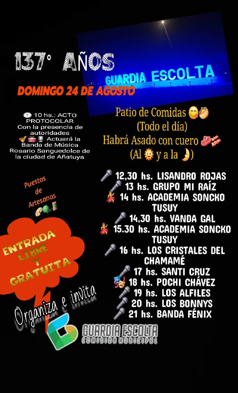 La localidad de Guardia Escolta se prepara para un gran festejo este domingo 24 de agosto, celebrando sus 137 años de historia con una jornada de música, tradición y comunidad que se espera que convoque a toda la región.