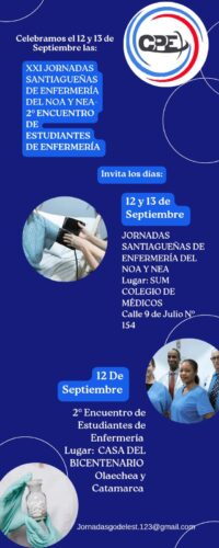 El Colegio de Profesionales de Enfermería de Santiago del Estero, los invita a participar de las XXVI Jornadas Santiagueñas de Enfermería del NOA/NEA y del II Encuentro de Estudiantes de Enfermería de la Provincia “Desafíos actuales de enfermería en el sistema público de la provincia”, a realizarse el 12 y 13 de Septiembre del presente año en la Ciudad Capital de Santiago del Estero. Las mismas contarán con la presencia de la presidente de la Federación Argentina de Enfermería, Mgt. Claudia Moreno; el Director de Enfermería del Hospital Garrahan, Lic. César Avellaneda; Teleenfermeria, Lic. Marcela Martinez; Directora de la Dirección Nacional de Enfermeria, Dra. Silvia Ridriguez y el presidente del Comité de Bioética del Hosp. de Niños de Tucumán, Lic. Lucas Acosta.