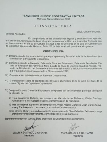 Selva: Tamberos Unidos C.L. Convoca a Asamblea Ordinaria Clave para Definir la Conducción y el Destino Económico