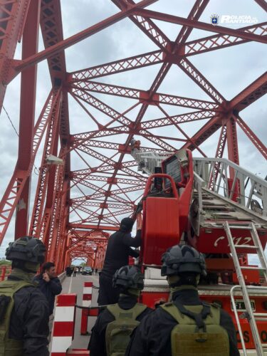 Todo empezó pasadas las 16.30, cuando automovilistas y vecinos del barrio Río Dulce alertaron a la Policía al ver a un hombre trepando las estructuras metálicas del emblemático puente que une Santiago del Estero con La Banda. En cuestión de minutos, el lugar se convirtió en el epicentro de un gran operativo: efectivos de la USAR (Unidad para Situaciones de Alto Riesgo), del GER, de Infantería, bomberos y personal de salud trabajaron bajo la supervisión de la fiscal María Alejandra Holgado.