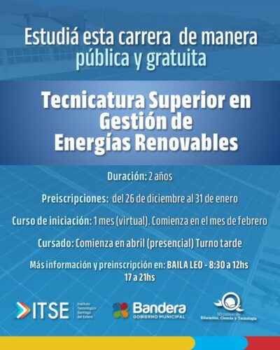 Bandera, Santiago del Estero – En un importante anuncio para el desarrollo educativo y profesional de la región, el intendente de Bandera, Jairo Colaneri, presentó oficialmente la apertura de la Tecnicatura Superior en Gestión de Energías Renovables. Esta propuesta académica, de carácter gratuito, llega a la ciudad a través del Instituto de Tecnología de Santiago del Estero (ITSE), dependiente del Ministerio de Educación de la provincia.
