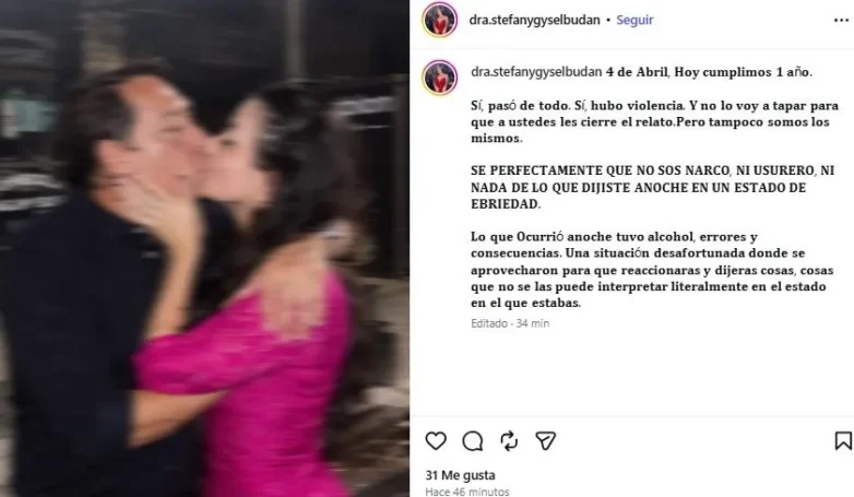 A través de un mensaje publicado en sus redes sociales, Budan sorprendió al reconocer situaciones de violencia dentro de la relación. “Hoy cumplimos un año. Sí, pasó de todo. Sí, hubo violencia. Y no lo voy a tapar para que a ustedes les cierre el relato. Pero tampoco somos los mismos”, expresó, en un texto que rápidamente se viralizó y generó múltiples reacciones.