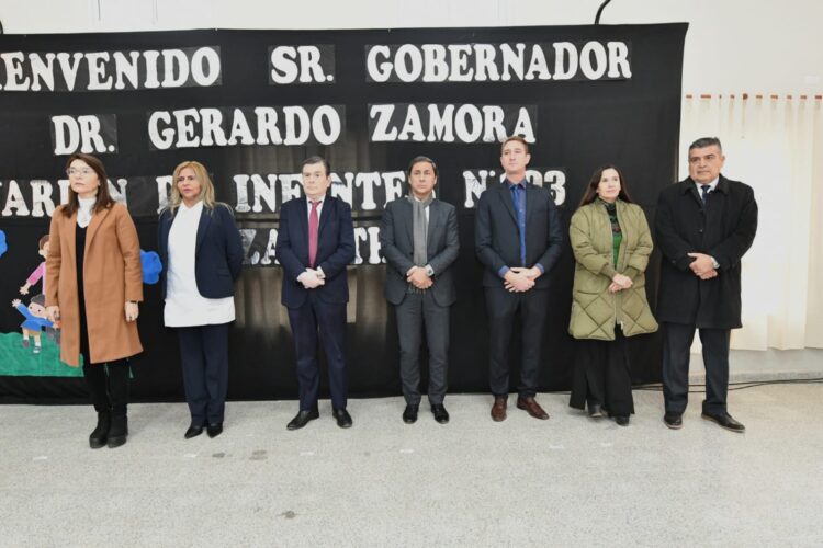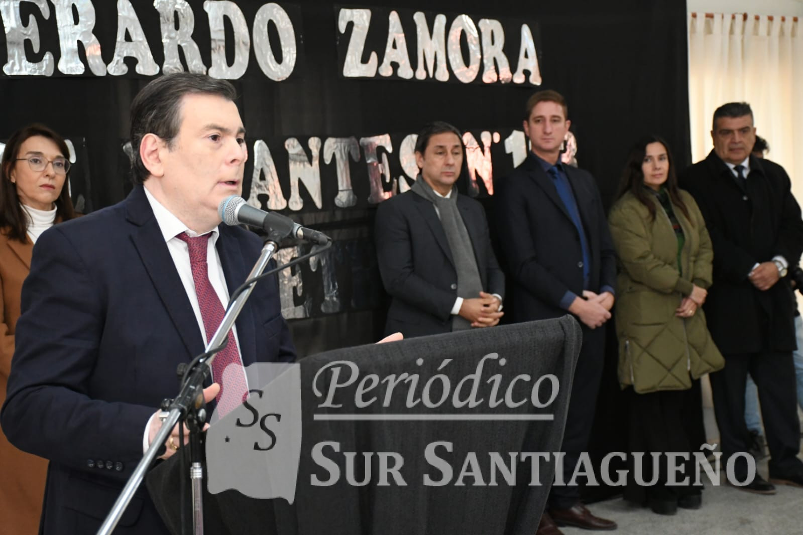 El corte de cintas fue encabezado por el gobernador Gerardo Zamora, junto con el vicegobernador Carlos Silva Neder y los ministros de Educación, Mariela Nassif, y de Obras Públicas, Aldo Hid, y la presidente del Consejo General de Educación, María Elena Herrera.