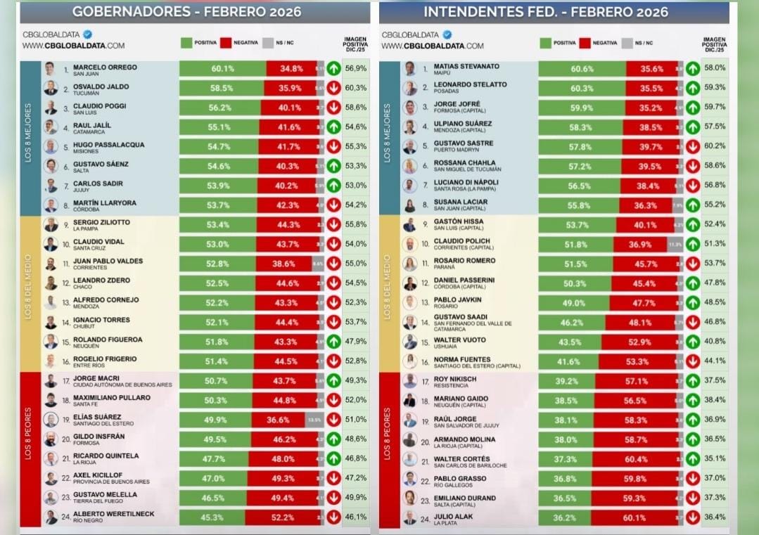 La última encuesta de CB Consultora, correspondiente a febrero de 2026, posiciona a Marcelo Orrego (gobernador de San Juan) como el mandatario con mayor imagen positiva del país, alcanzando un notable 60,1% de aprobación ciudadana. Muy cerca aparece Osvaldo Jaldo, gobernador de Tucumán, con 58,5%, seguido por Claudio Poggi en San Luis, con 56,2%, consolidando al NOA y Cuyo como regiones con fuerte respaldo a sus líderes provinciales.