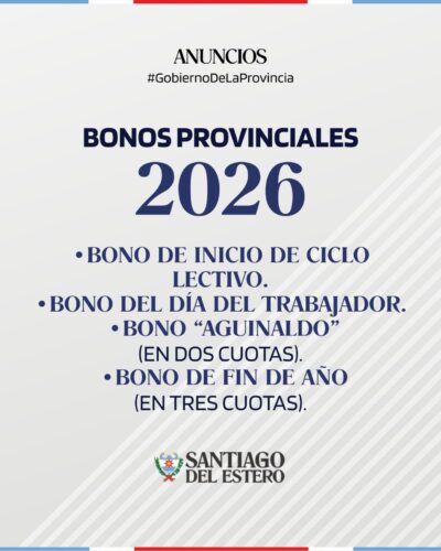El Gobierno provincial confirmó que durante el año 2026 se sostendrá el mismo esquema de bonos provinciales aplicado en 2025, con cuatro instancias principales:
