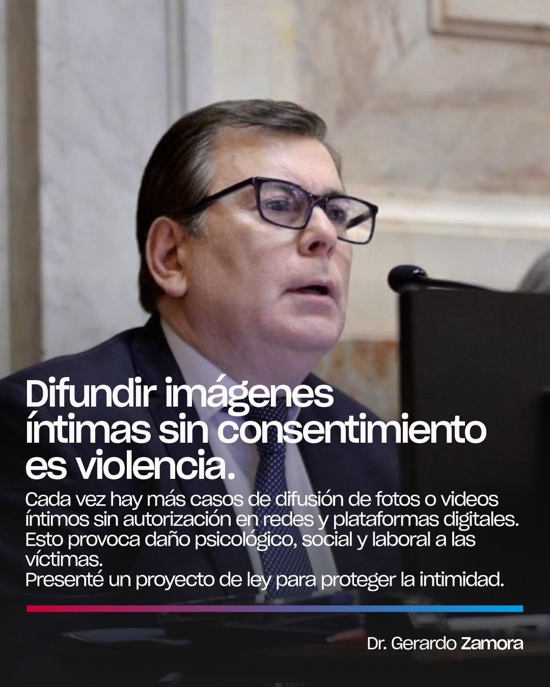 Hoy, tal como lo había adelantado, el senador Gerardo Zamora presentó en el Congreso de la nación el tratamiento de un proyecto de ley que busca incorporar al Código Penal sanciones específicas para la difusión no consentida de imágenes o contenidos íntimos, una práctica conocida como “pornovenganza” o violencia digital.
